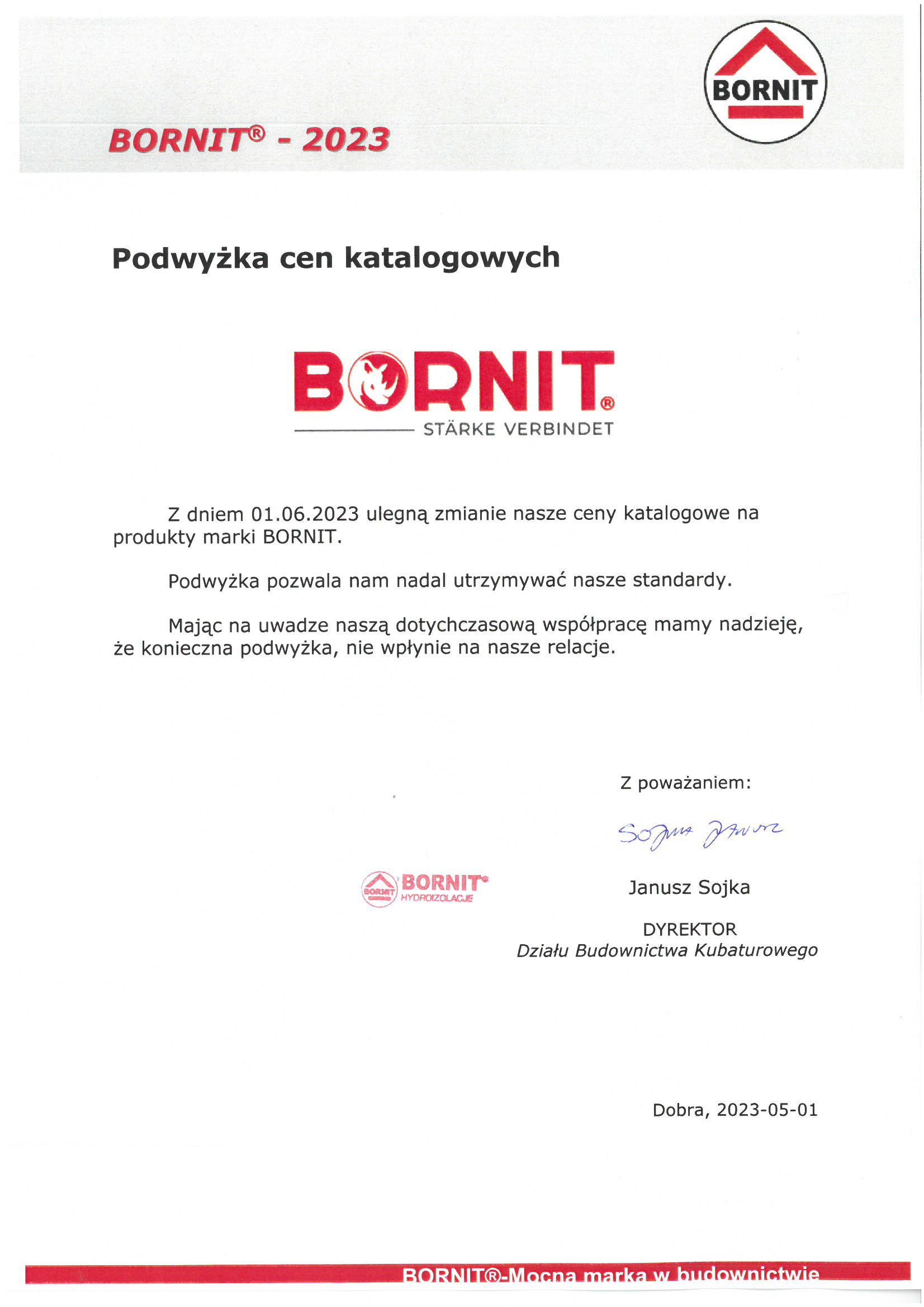 Z dniem 01.06.2023 ulegną zmianie nasze ceny katalogowe na produkty marki BORNIT.