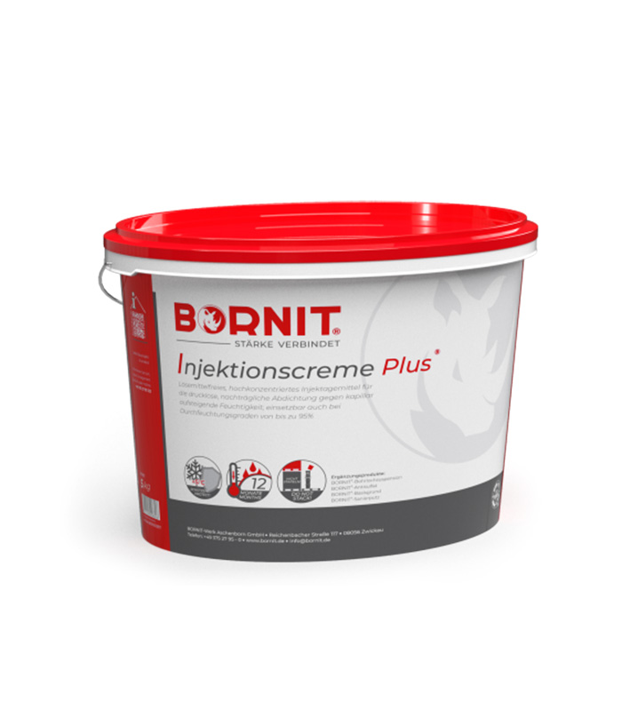 BORNIT®-Injektionscreme Plus wysokiej jakości, gotowy do użycia, wodnisty krem do iniekcji na bazie silanu. W murze prowadzi do hydrofobizacji kapilarów poprzez przenikanie nawet do najwyższych z nich.